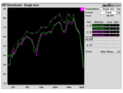 The graph shown is the result of an electroacoustical analysis test performed by Oticon. The green line shows the sound coming into a hearing aid without Ear Gear and the pink line shows the sound quality with Ear Gear. The results of this audioscan test indicate that there is no more than a 1dB reduction with Ear Gear; essentially it is acoustically transparent.