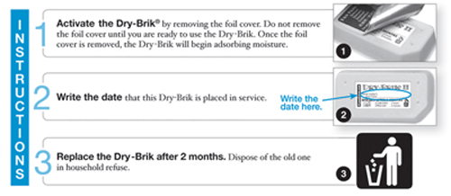 Please note: the current design of Dry-Brik II no longer has the timestrip featured in previous versions but instead has a space for you to write the date into. Replace after 2 months.