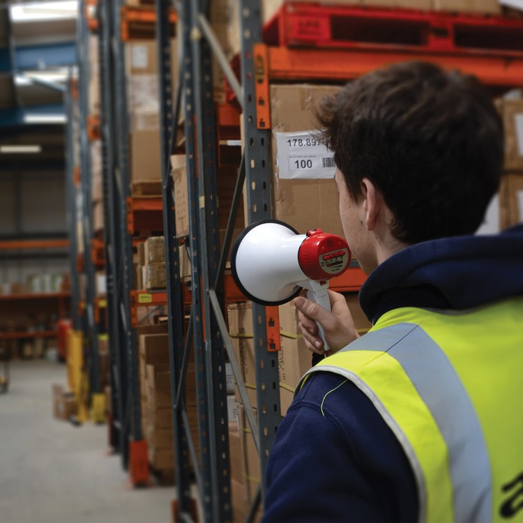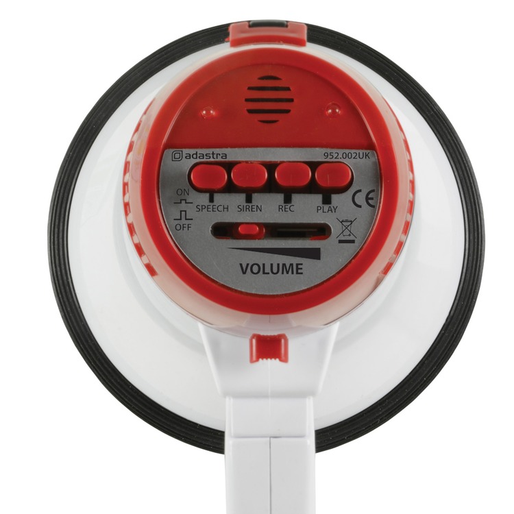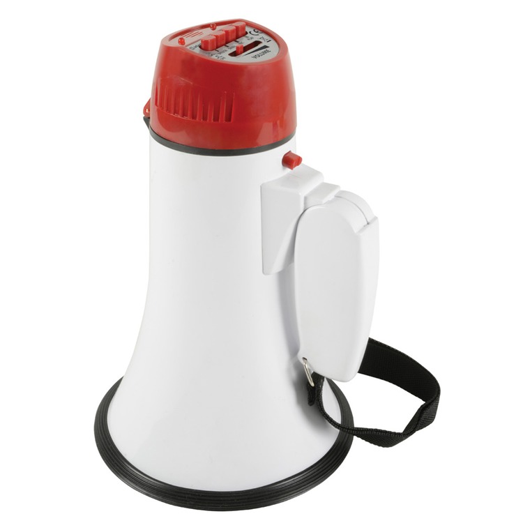 The L01 10 Watt compact megaphone has folding handle and wrist...