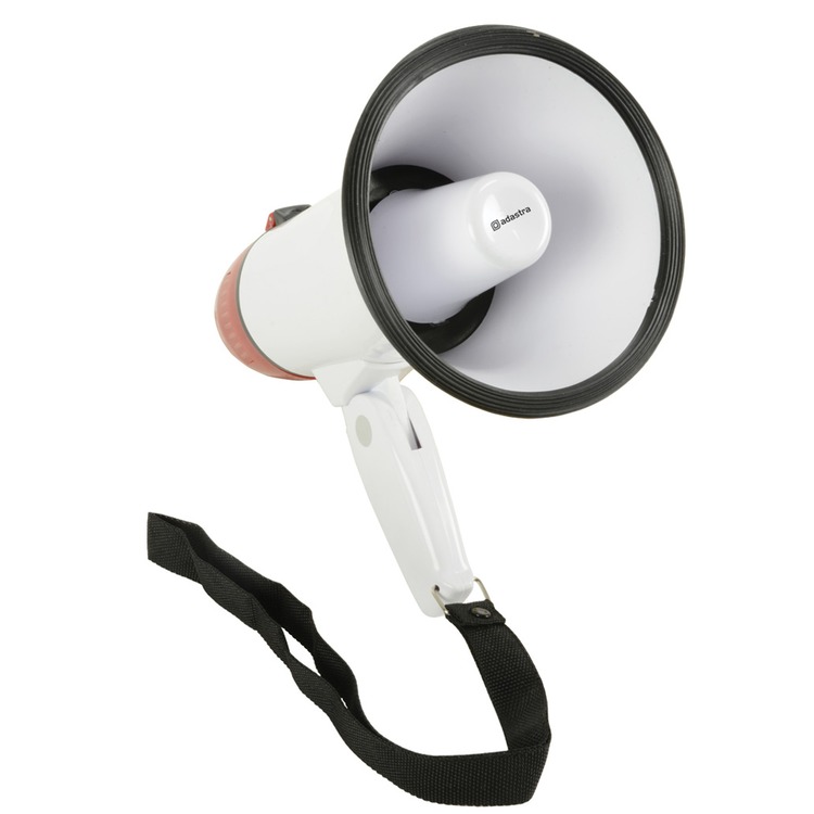A compact megaphone with folding handle and wrist strap for ultimate portability.