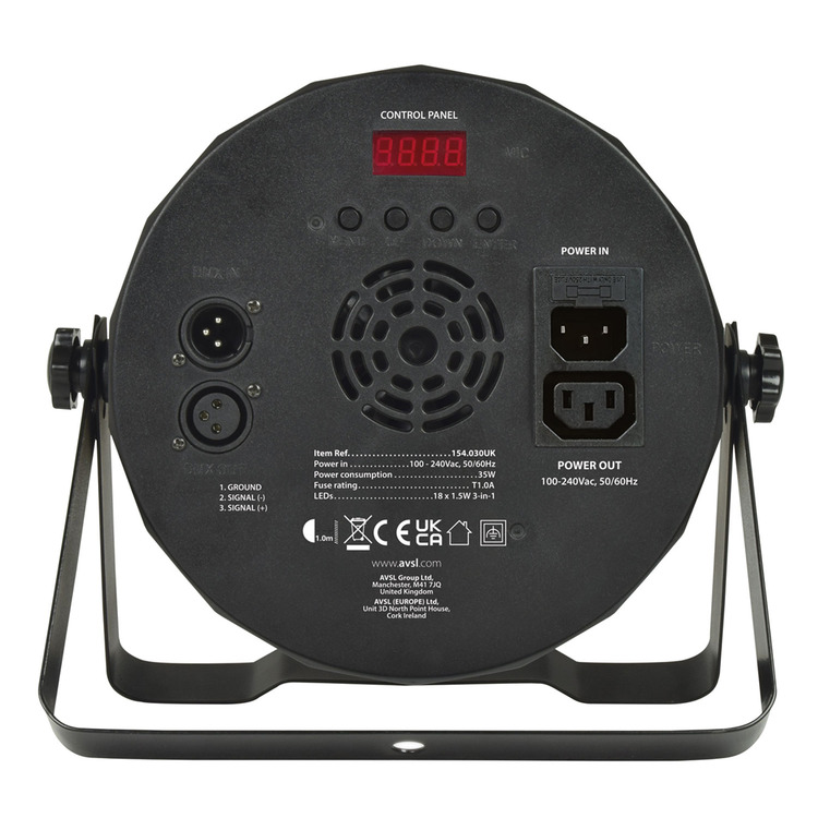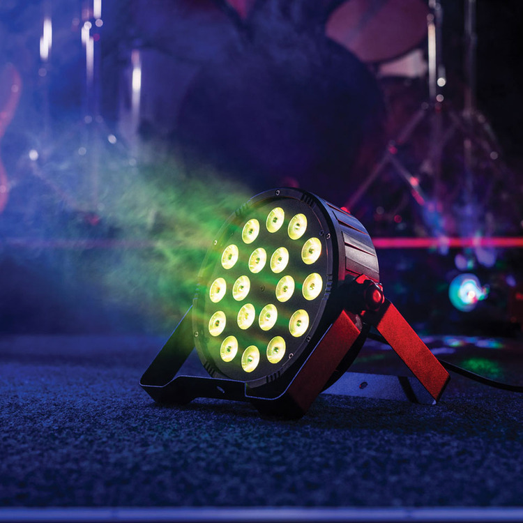 A lightweight and compact LED PAR Can fitted with 18 3-in-1 RGB LEDs. This unit can be controlled by auto, sound-to-light, master/slave programs or via DMX and provides a great value solution for background wash illumination.