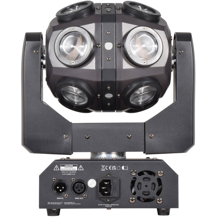 The unit can be operated on auto, sound-to-light or DMX modes and can be free standing or mounted to trussing using the supplied fixing bracket and is ideal as a centrepiece light in bars, nightclubs and functions.