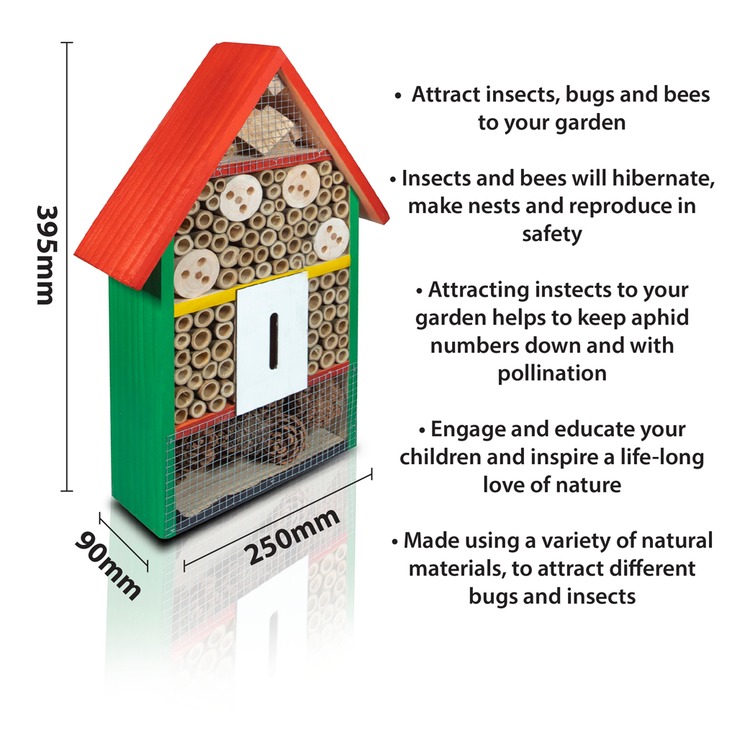 Engage and educate your children about our fragile eco-system and inspire a life-long love of nature.No assembly is required and the bug hotel will arrive ready for your first guests. A hook on the back allows you to hang the hotel from nails or trees.