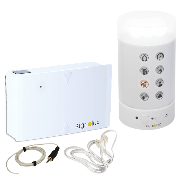 The Signolux system is based around a portable Tower chime unit which receives signals from the transmitters (200m range) and alerts you to the different events with a flashing symbol, adjustable loud sound (up to 95dB) and a bright strobe light.