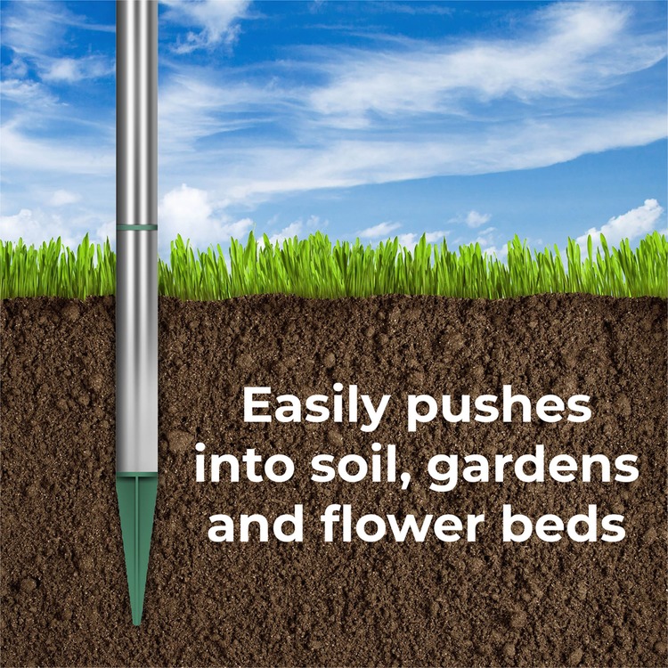 The repeller is charged during daylight hours using free energy from the sun, simply push into grass or borders with the supplied ground spike.
