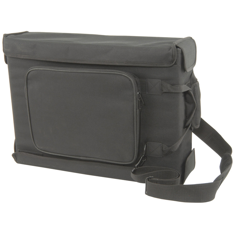 Equipment is protected by an inner wooden frame and secured by metal rack strip front and rear. Also fitted with carrying handle, shoulder strap and zipped outer pocket.