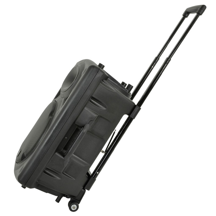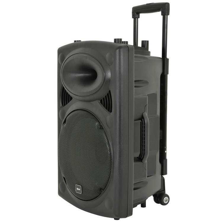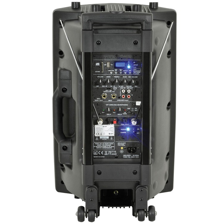 Self-contained portable PA units based on the QR-series speaker cabinet. Built-in amplifier operating from mains or internal rechargeable battery powering a main driver and compression driven horn unit. A pair of VHF handheld wireless microphones are included with the receiver built into the mixer/amp section at the rear along with 2 further mic inputs, auxiliary line input and integral USB/SD media player. A moulded handle and pole mount are included and a retractable trolley handle and rear wheels provide easy portability.