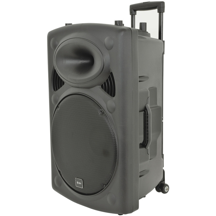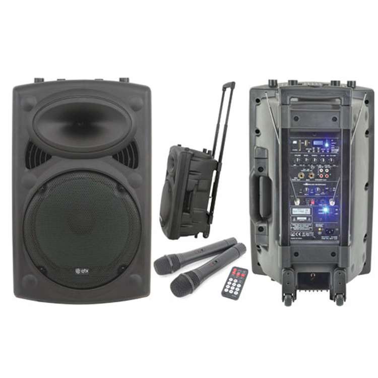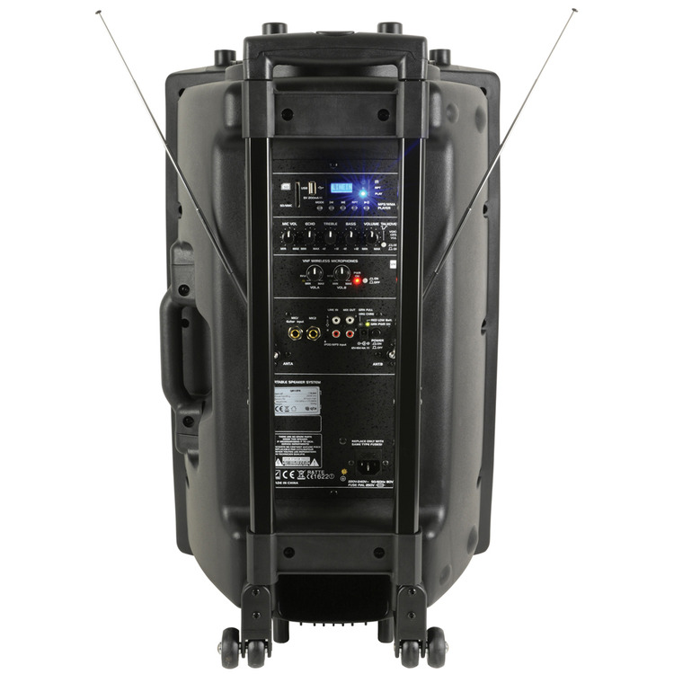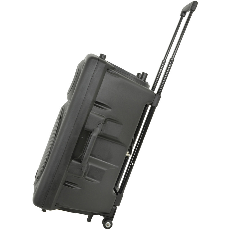 A compact, trolley-style wheeled portable PA unit with a top-mounted retractable pull handle and side-mounted carry handle. Versatile input options include 2 VHF wireless microphones (included), 2 further mic inputs (one can also be used for guitar), mini jack (for phones, tablets, laptops and mp3 players), and RCA in/out (ideal for DJs).
