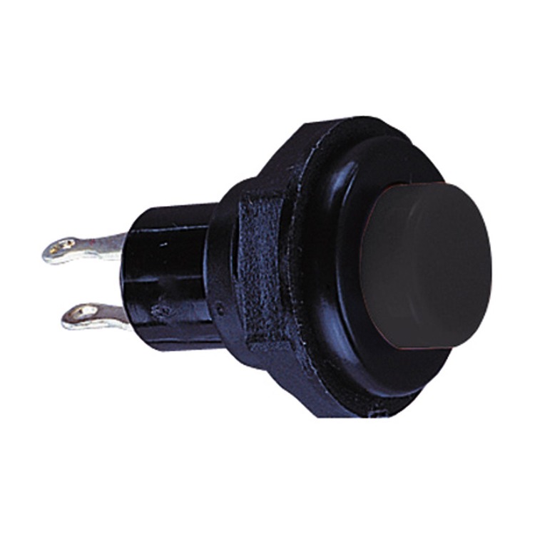 Round single-pole single-throw (SPST) push to make switch / button with panel mounting, momentary action and a fixing hole of 12mm. Constructed of metal housing with plastic button.