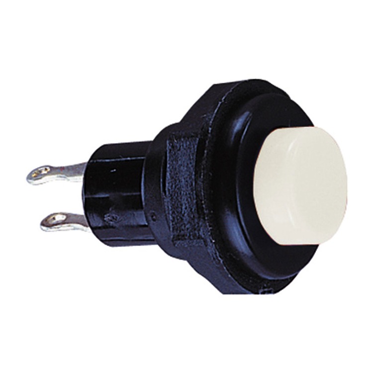 Round single-pole single-throw (SPST) push to make switch / button with panel mounting, momentary action and a fixing hole of 12mm. Constructed of plastic housing with plastic button.