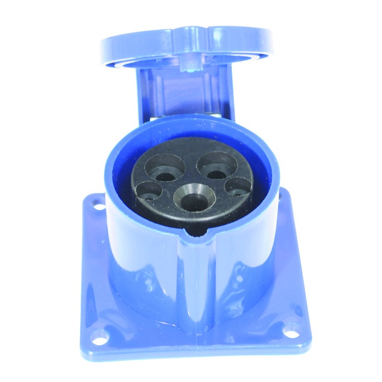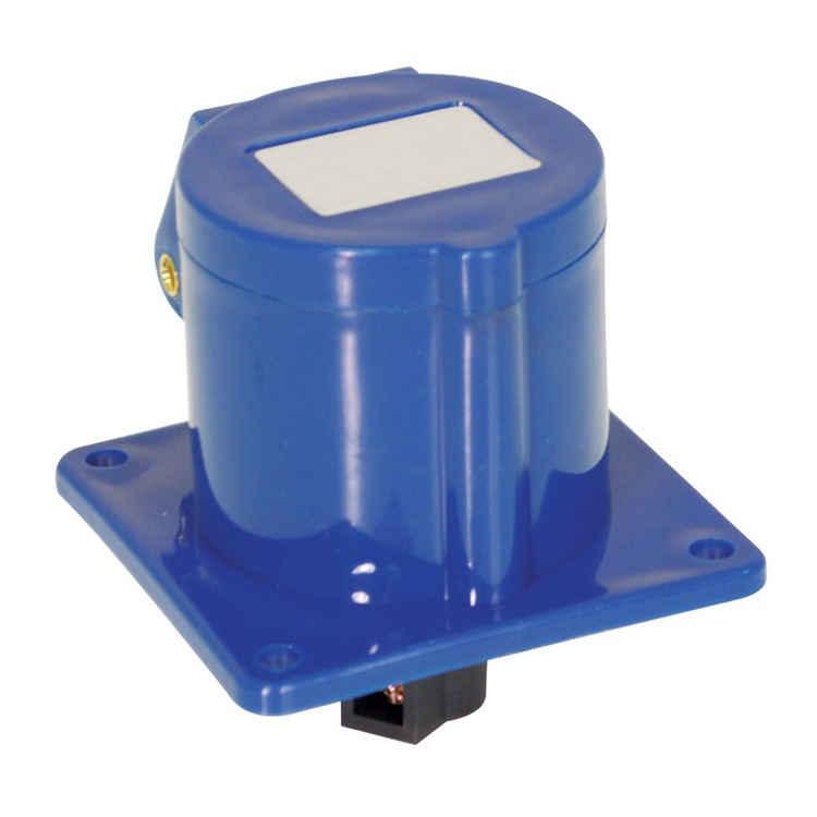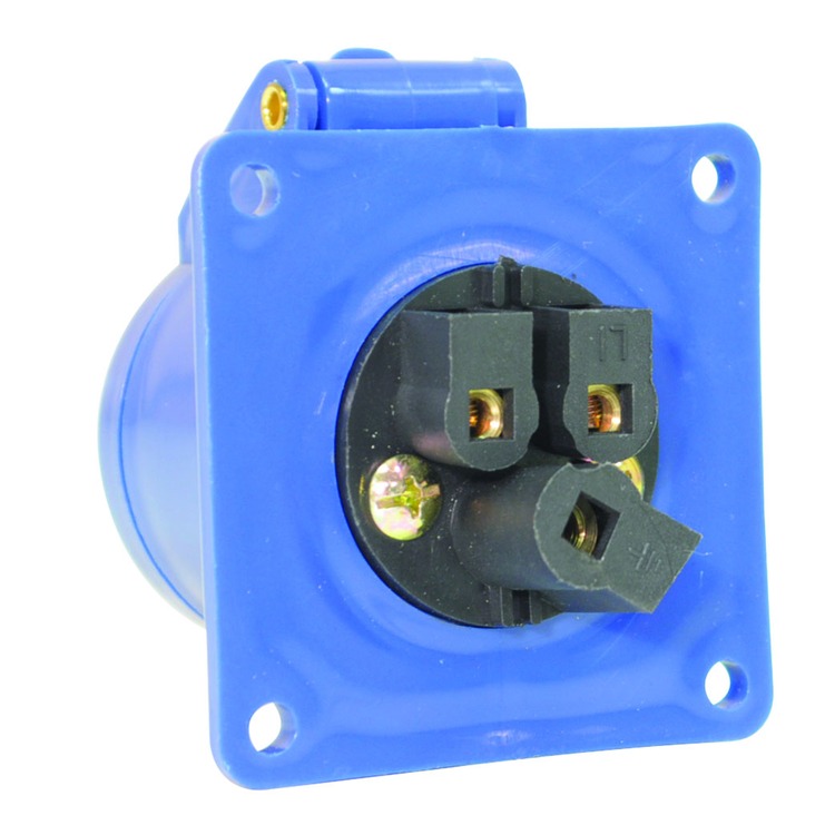 A 230 V, 16 A, high current straight outlet panel mount, 3 contact, in blue with hinged flap.