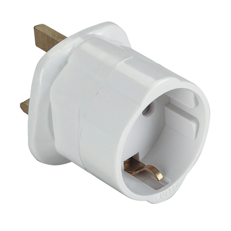 A travel adaptor to convert from European Schuko plug to standard UK 13 A plug (fused at 13 A).