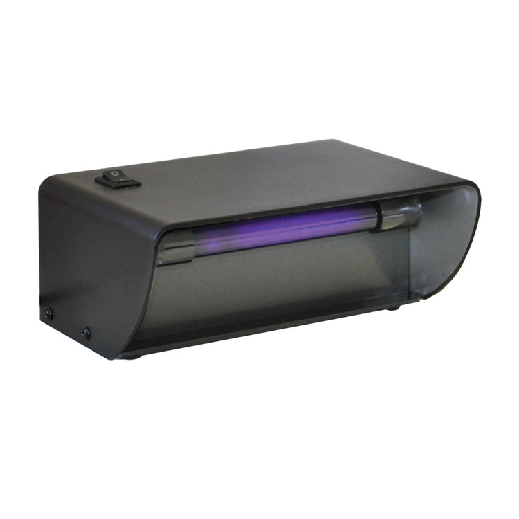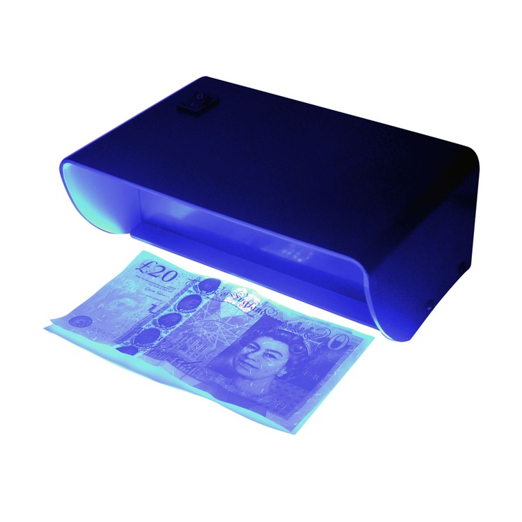 A mains powered ultra violet bank note checker housed in a rugged black plastic case. Simply hold the note below the UV light for inspection.