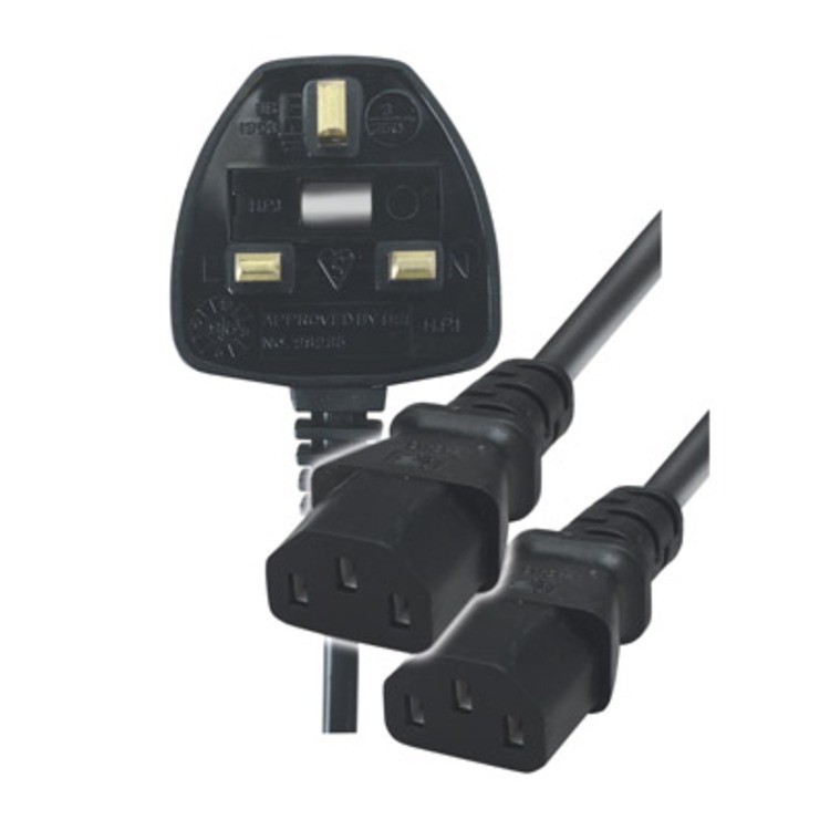 Black Y Junction mains power lead with moulded UK 13 A plug to 2 x IEC sockets.