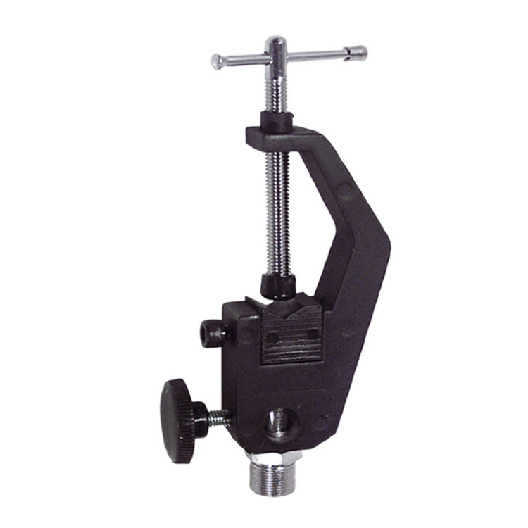A useful microphone holder with the ability to be clamped onto any suitable surface up to 25 mm thick, comes with a reversible thread adapter. Made from metal.