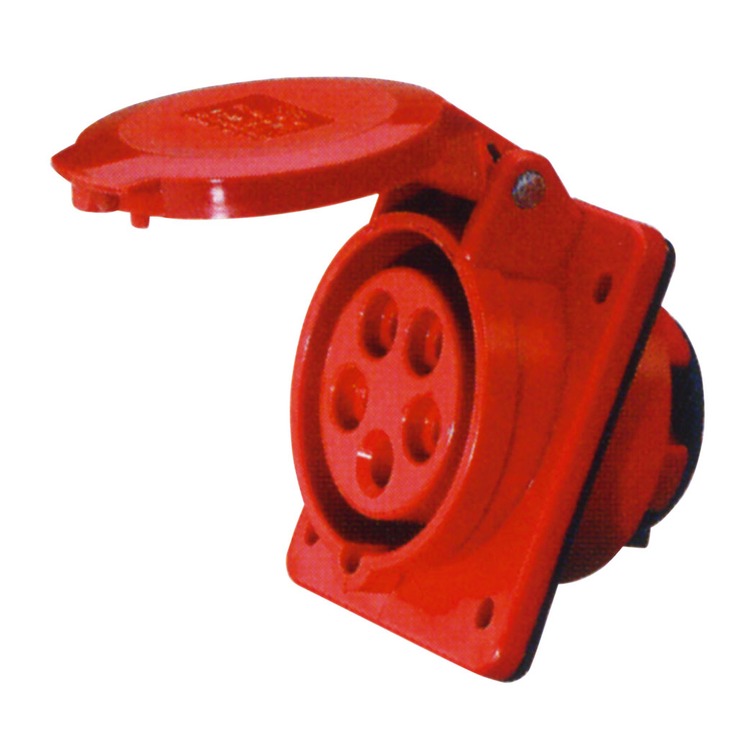 A 400 V, red, high current 32 A, angled outlet 5 contact panel mount.