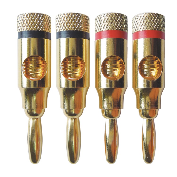 Very high quality gold plated Banana Plug with metal body and coloured identification bands. Will accept cable up to 5.5 mm diameter. Screw terminals. Packed 2 pairs per pack.