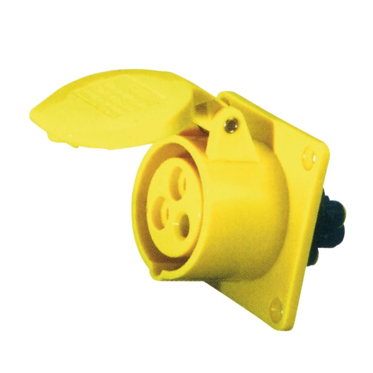 A high current straight outlet panel mount in yellow with 110V, 16A 3 contact plug.