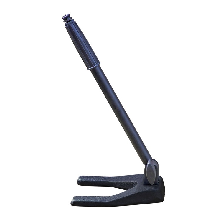 A black, table or desk microphone stand with a stable, horseshoe shaped base and featuring both angle and height adjustment.