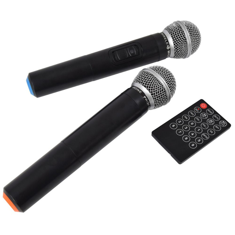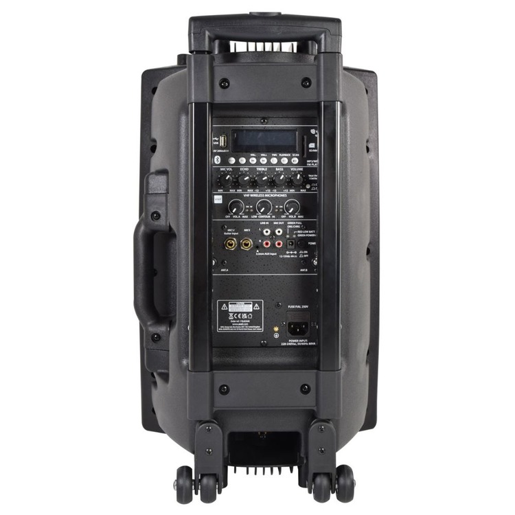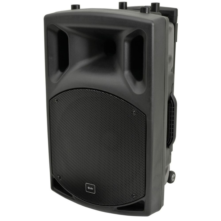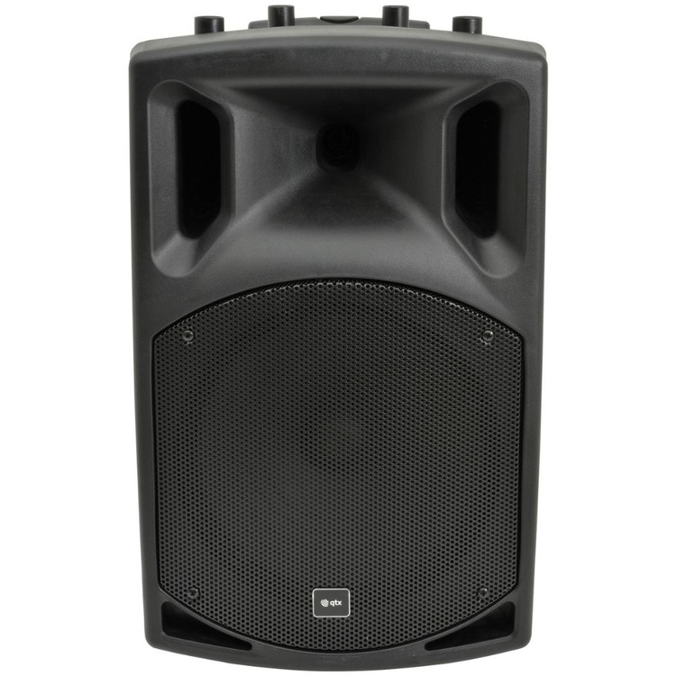 QTX QX12PA Portable PA unit with 12" Driver, USB/SD/FM Player & Bluetooth Inputs. A self-contained PA system with pull and carry handles for easy portability, and a host of connectivity options including Bluetooth. The unit is supplied with 2 VHF wireless microphones, and features 2 further mic inputs, one of which doubles as a guitar input.