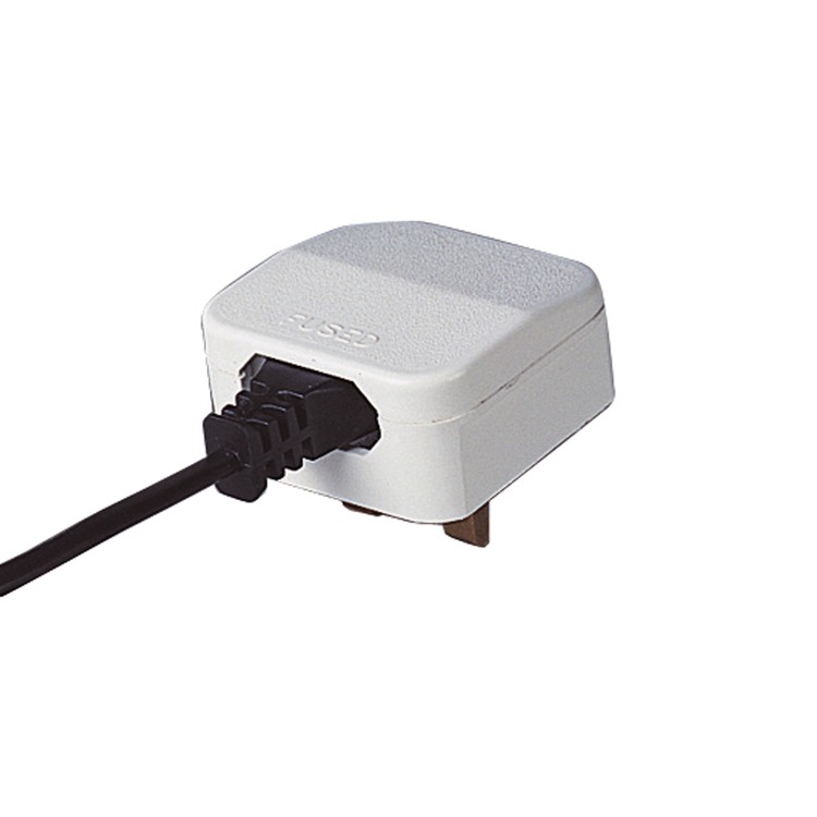 Converts 2-pole CEE7 Euro plugs to 3-pin UK mains plug. With 3A ASTA approved fuse. Meets requirements of BS5733 and ASTA standard 120.