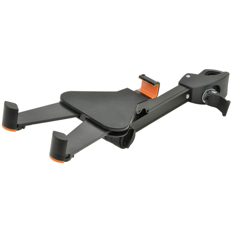 A universal tablet holder designed to clamp onto any kind of stand. The integral mechanisms in the clamp allow for easy installation with no tools required.