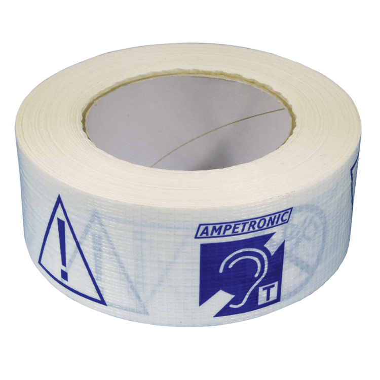 Ampetronic Flat Cable 40IL02 (FB 1.8) is intended to be installed under carpets and other floor coverings using this 40IL03 adhesive installation / warning tape. The adhesive warning tape provides a warning of the loop presence, fixes the flat copper cable in place, and provides mechanical protection. The adhesive is formulated not to 'bleed' and has a long life.
